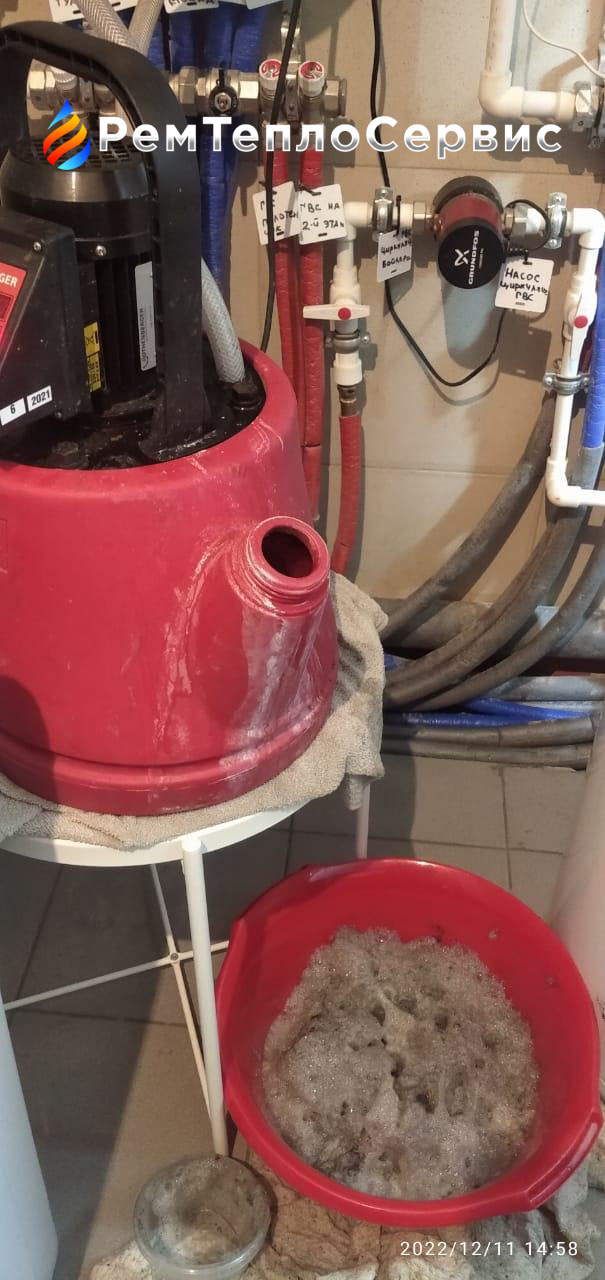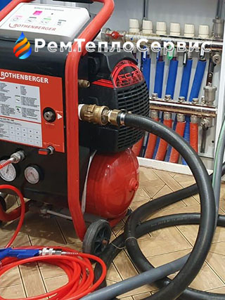 Мы работаем с помощью промывочного насоса ROCAL 20 и компрессора Rothenberger Ropuls. В сочетании с безопасными реагентами это позволяет эффективно удалить накипь, ржавчину и шлам из всех элементов системы, включая радиаторы, трубы, коллекторы, магистрали и теплообменник котла.